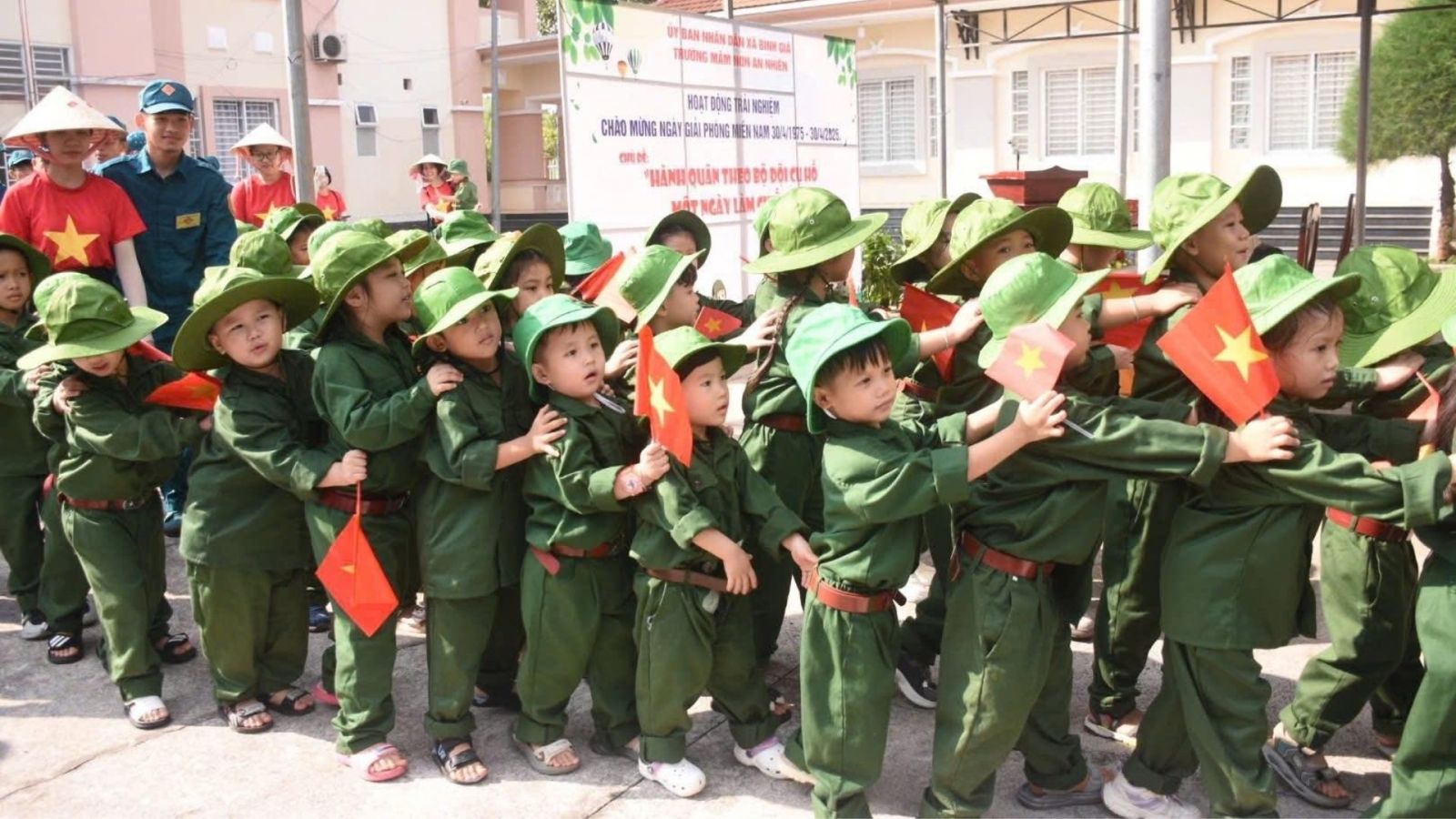 Nhằm chào mừng kỷ niệm 51 năm Ngày giải phóng miền Nam, thống nhất đất nước, Trường mầm non An Nhiên phối hợp với Ban Chỉ huy Quân sự xã Bình Giã tổ chức hoạt động trải nghiệm với chủ đề “Hành quân theo bộ đội Cụ Hồ – Một ngày làm chiến sĩ”. Chương trình thu hút sự tham gia của 70 trẻ mầm non trong độ tuổi từ 4 đến 6 tuổi. Đây là hoạt động giáo dục ngoại khóa ý nghĩa, giúp trẻ có cơ hội tiếp cận môi trường quân đội một cách sinh động. Thông qua đó, góp phần bồi dưỡng tình yêu quê hương, đất nước ngay từ lứa tuổi nhỏ. Đồng thời tạo sân chơi bổ ích, phù hợp với đặc điểm tâm lý của trẻ.