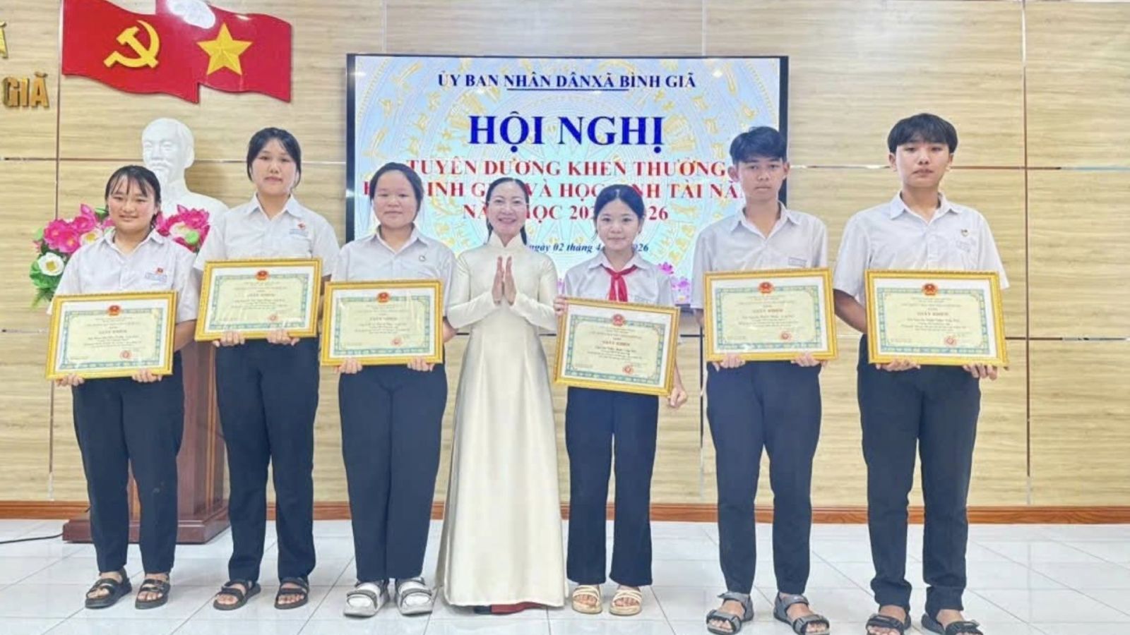 Chiều ngày 2/4/2026, Ủy ban nhân dân xã Bình Giã tổ chức hội nghị tuyên dương, khen thưởng học sinh giỏi và học sinh tài năng năm học 2025 - 2026. Tham dự hội nghị có đại diện lãnh đạo Đảng ủy, Ủy ban nhân dân xã, Ủy ban Mặt trận Tổ quốc Việt Nam xã, cùng các ban ngành, đoàn thể, Ban Giám hiệu các trường học trên địa bàn. Đặc biệt, hội nghị có sự hiện diện của các em học sinh đạt thành tích xuất sắc trong học tập. Đây là hoạt động nhằm ghi nhận, biểu dương những nỗ lực học tập và rèn luyện của học sinh trong năm học vừa qua. Đồng thời, góp phần lan tỏa phong trào thi đua học tập trong toàn xã.